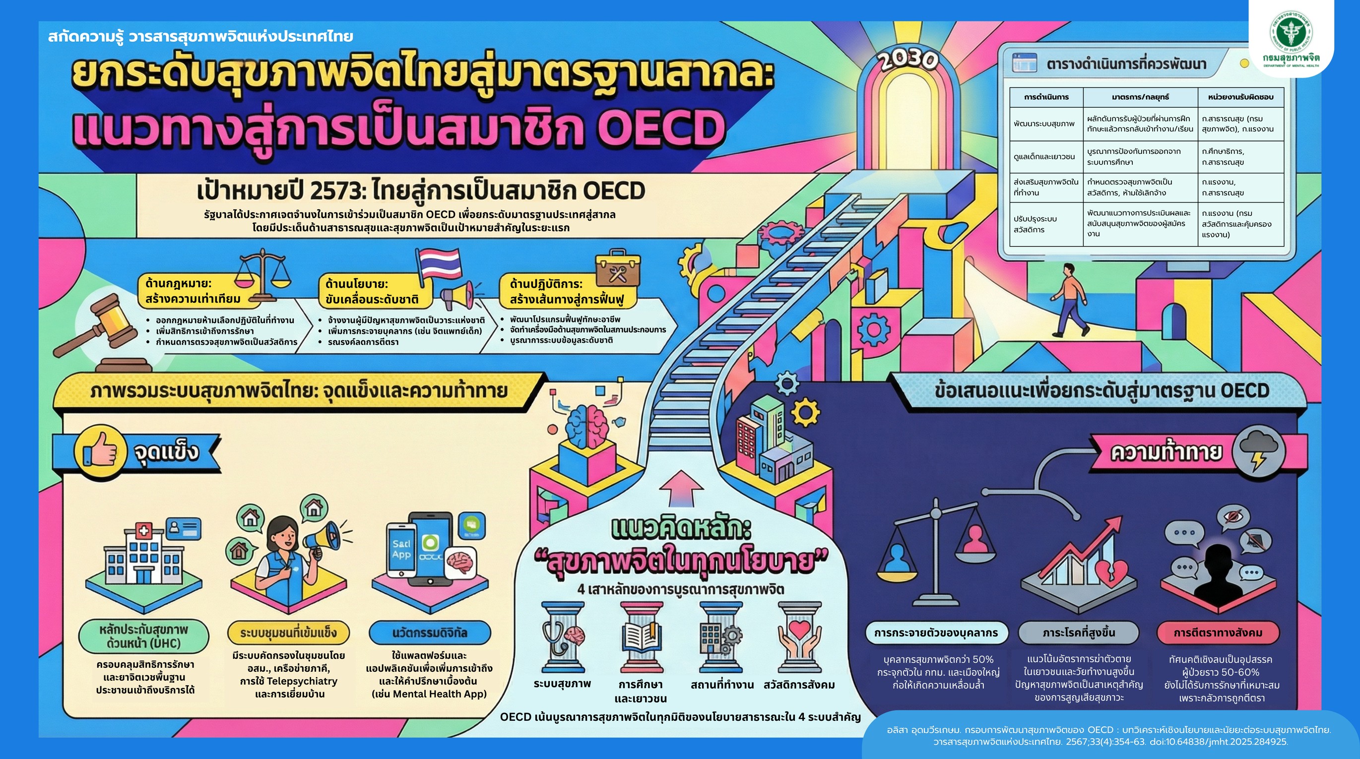 ❖ ความรู้ใหม่ : กรอบ OECD (OECD/LEGAL/0420) เน้นการพัฒนาแบบบูรณาการ 4 เสาหลัก ได้แก่ ระบบสุขภาพ การศึกษาและเยาวชน สุขภาพจิตในที่ทำงาน และสวัสดิการ โดยการขับเคลื่อนอย่างเป็นรูปธรรมต้องอาศัยความร่วมมือจากหลายภาคส่วน